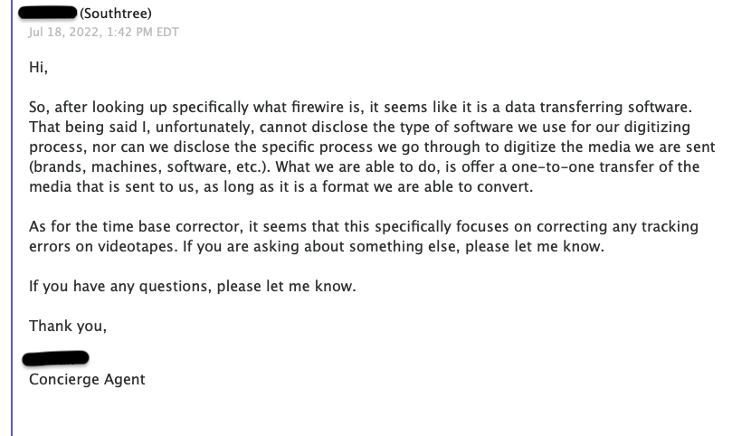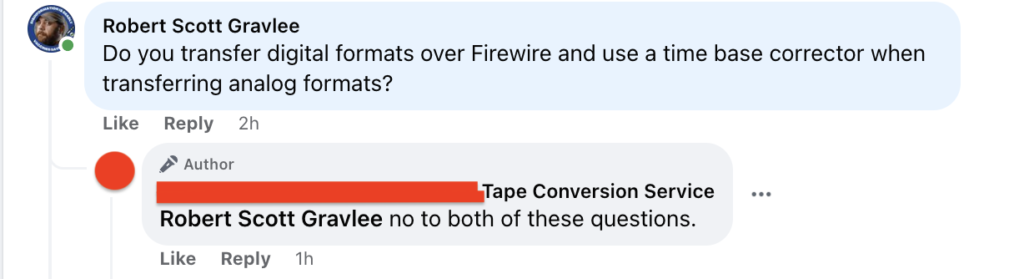Ask yourself are getting a digital transfer of your home movies? Some transfer houses don’t properly transfer digital formats converting these digital formats to analog then back to digital these formats must be transferred over firewire. This is done both out of ignorance and convenience. The hope is that you won’t know that you’re loosing quality. Also it is far easier to transfer tapes that way with modern computers. One prominent company, which is actually three companies owned by the same entity, informed me that FireWire is software and that they could not discuss it. Another company stated that they do not transfer using FireWire or employ a Time Base Corrector (TBC). The video below demonstrates this issue